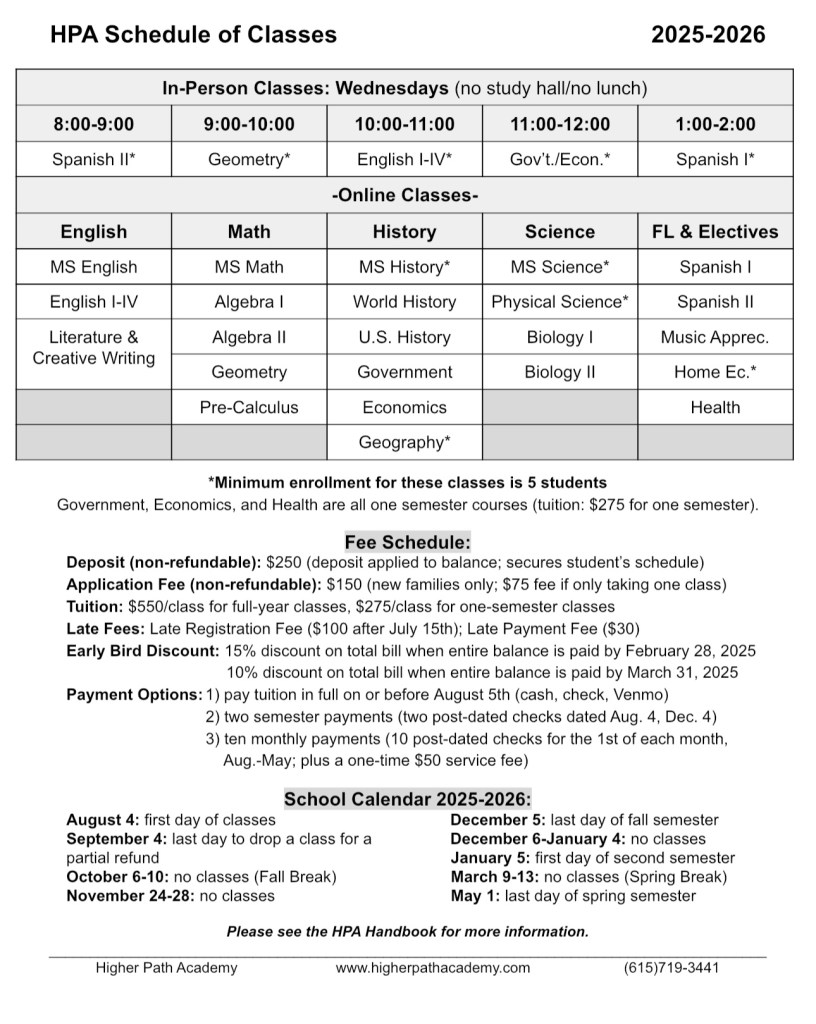 Schedule of Online Classes for the 2024-2025 School Year: